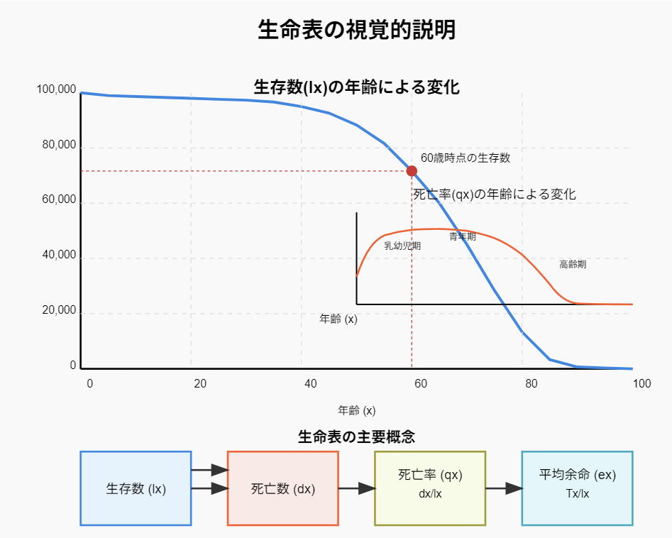 生命表(Life Table)は、ある集団における死亡や生存の確率を年齢または時間の関数として表したものです。以下の2種類があります: