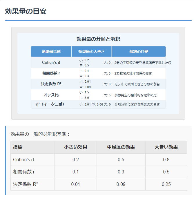 効果量は実質的な差を表す指標。p値は差があるか無いかの確率は分かるが、実質的な差の大きさは分からない。