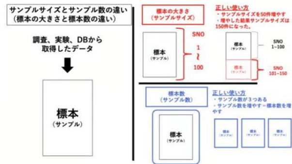 サンプルサイズは(サンプル数を複数あつめた)一つの全体の量と考えると良い サンプル数は標本の種類の数を表すので間違えないこと